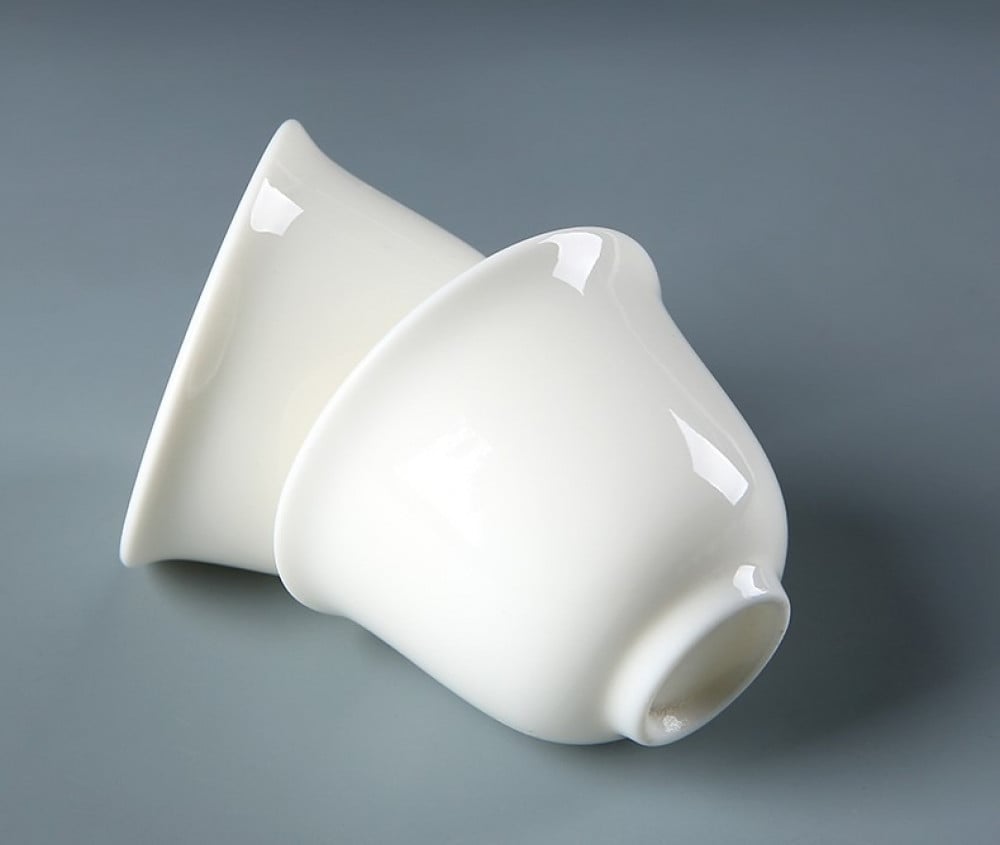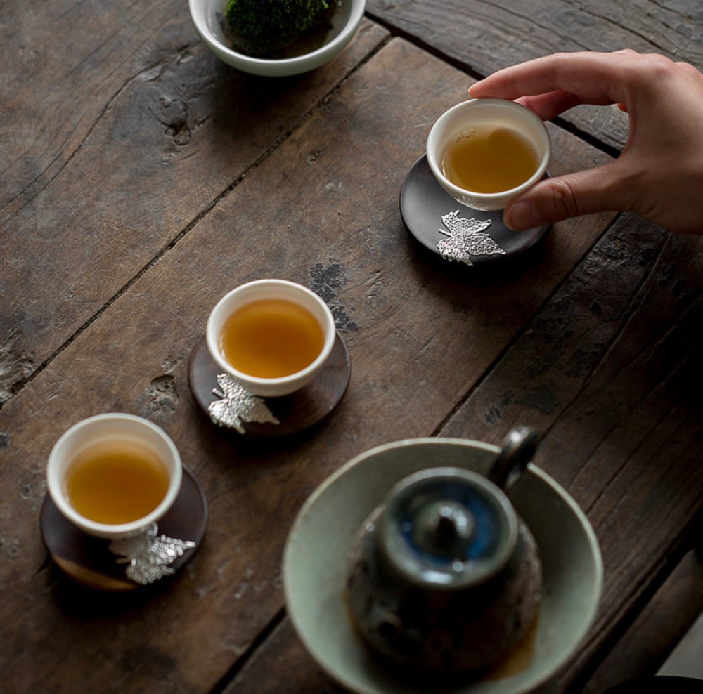 طقم 6 فناجيل بيضاء مع 6 قاعدات خشبية مزينة بورق الشجر الفضي